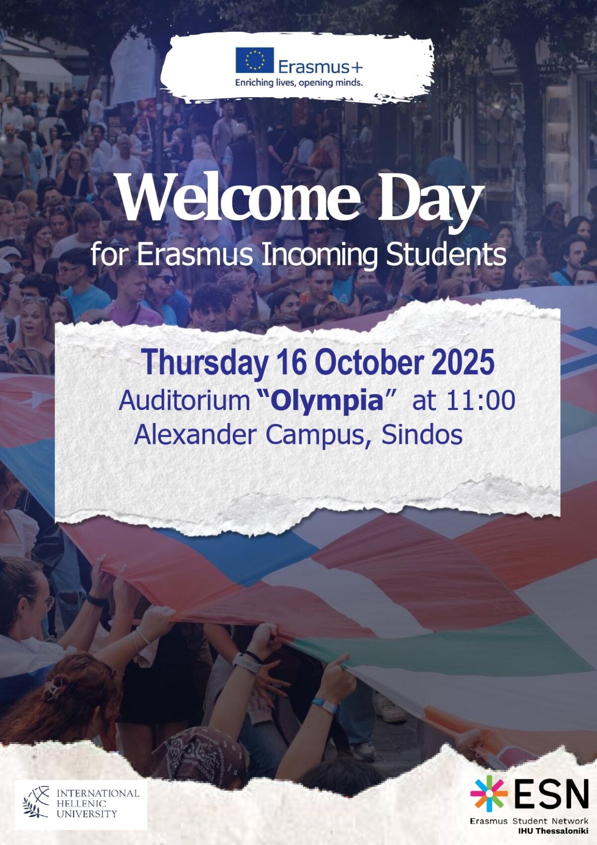 On behalf of the International Hellenic University and the Department of European and International Studies, we are pleased to inform you that on Thursday, October 16th, 2025, at 11:00 a.m., a Welcome Ceremony for Erasmus students will take place in the “OLYMPIA” Amphitheatre at the International Hellenic University for the Winter Semester 2025–2026.
