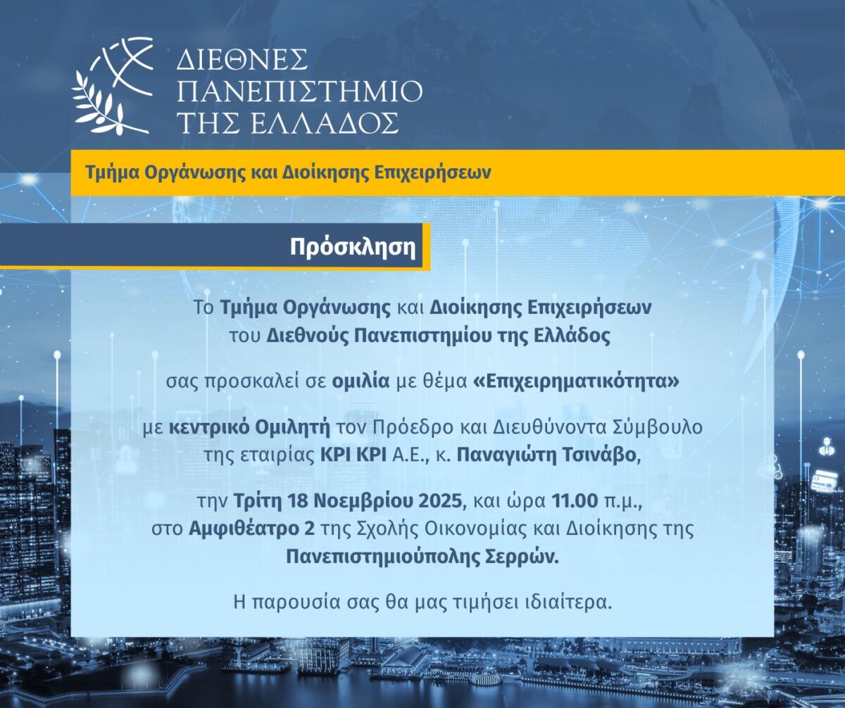 Πρόσκληση σε ομιλία με θέμα «Επιχειρηματικότητα» Πρόσκληση www.ihu.gr2025-11-07T16:35:50+02:00Πα, 07 Νοέ '25|Εκδηλώσεις|