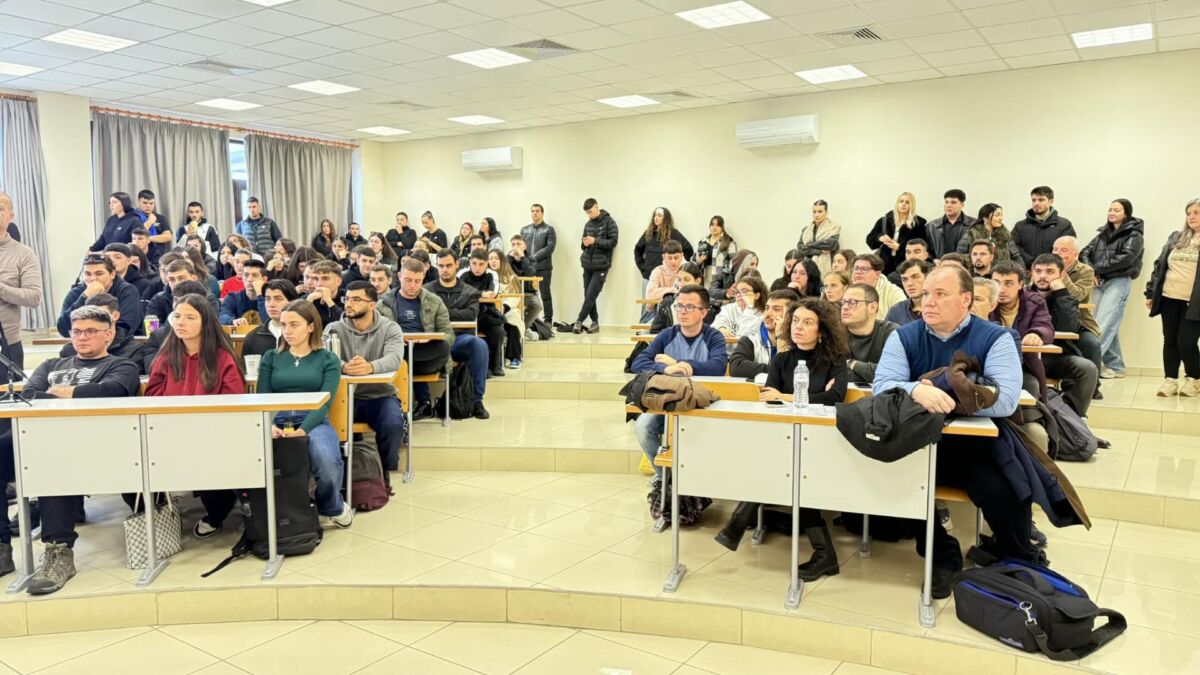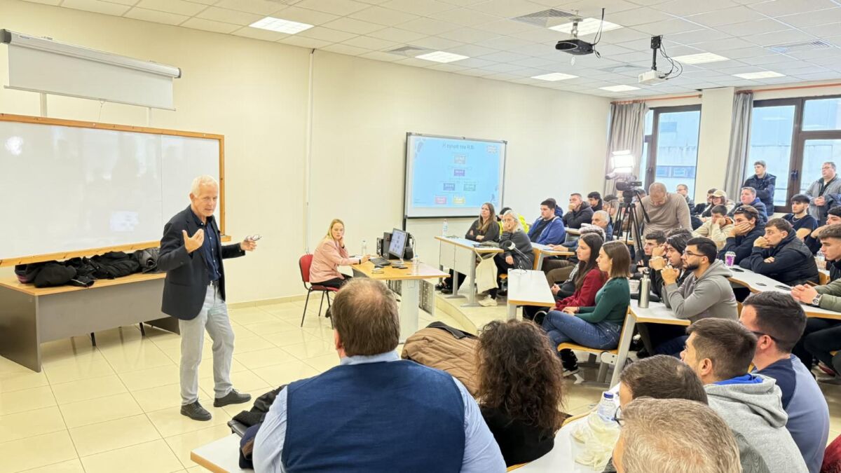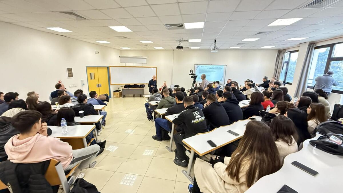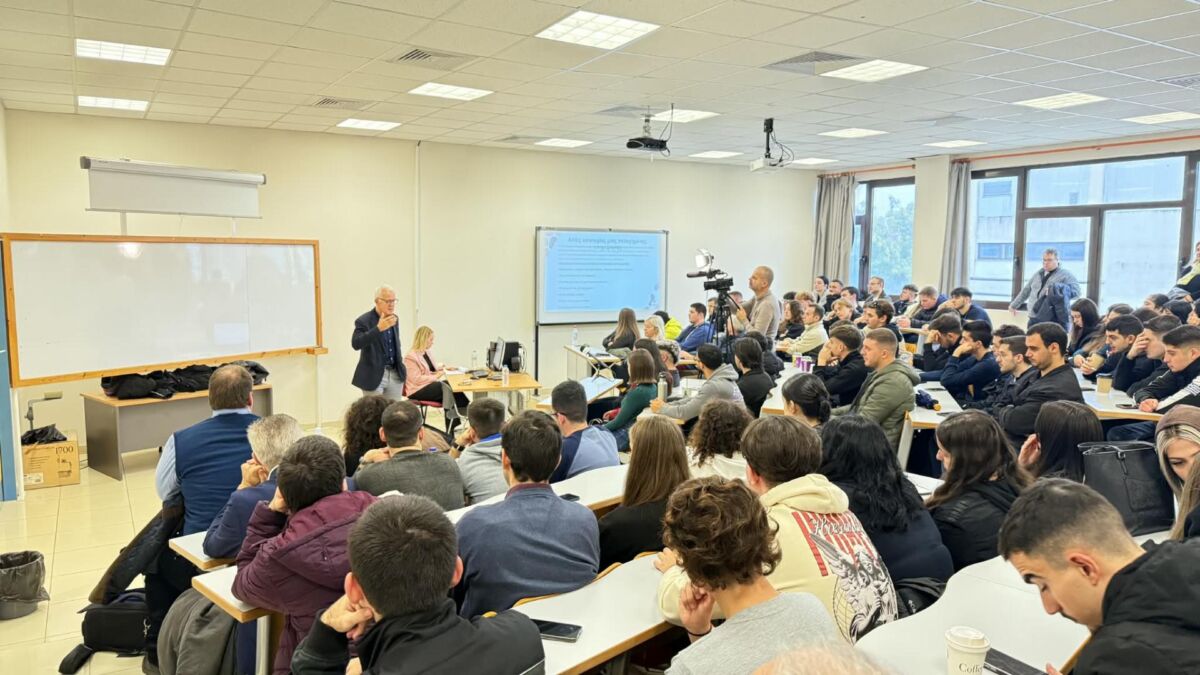 Στο τέλος της εκδήλωσης ακολούθησε συζήτηση και χρόνος για ερωτήσεις, με τους φοιτητές να συμμετέχουν ενεργά, γεμίζοντας το Αμφιθέατρο και δείχνοντας έντονο ενδιαφέρον για τα θέματα που παρουσιάστηκαν.