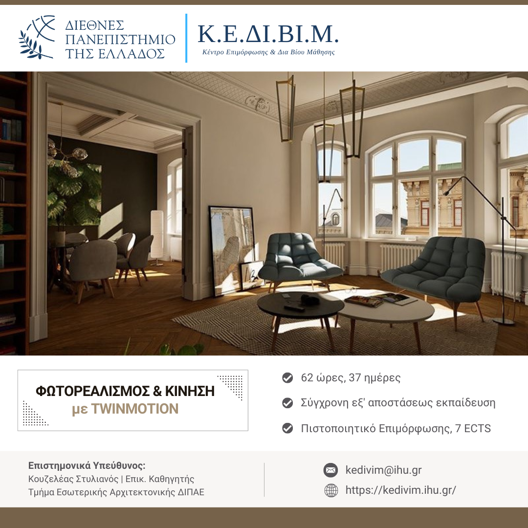 Νέο Επιμορφωτικό Πρόγραμμα από το ΚΕΔΙΒΙΜ ΔΙΠΑΕ: «Φωτορεαλισμός & Κίνηση με Twinmotion»