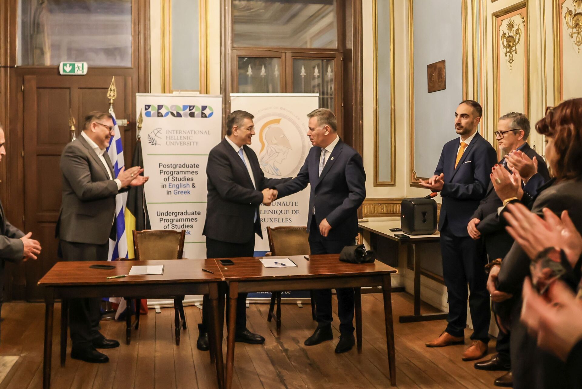 Το απόγευμα ο Πρύτανης κ. Σ. Αγγελόπουλος υπέγραψε Μνημόνιο Συνεργασίας με την Ελληνική Κοινότητα Βρυξελλών, η οποία και παραχωρεί τους χώρους όπου θα στεγαστεί το παράρτημα του Πανεπιστημίου. Το Μνημόνιο υπέγραψε από την πλευρά της Κοινότητας ο πρόεδρός της Φίλιππος Κοτσαρίδης. Πρόκειται για χώρο που βρίσκεται στο κτίριο, όπου φιλοξενείται η Ελληνική Κοινότητα Βρυξελλών, επί της οδού Rue de Suede 37, όπου έχει ήδη τοποθετηθεί η πινακίδα του Διεθνούς Πανεπιστημίου της Ελλάδος. Η ελληνική Κοινότητα είναι μια ιστορική κοινότητα, καθώς έχει ιδρυθεί στις 3 Οκτωβρίου του 1943. Στην τελετή της υπογραφής του Μνημονίου Συνεργασίας το παρών έδωσε και ο κ. Τζιτζικώστας, επισφραγίζοντας με εμφαντικό τρόπο την υποστήριξή του στο εγχείρημα, το οποίο χαρακτήρισε ως εμβληματικό.