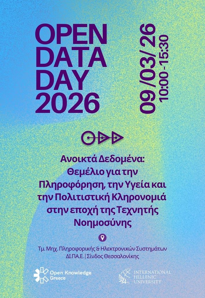 Τη Δευτέρα 9 Μαρτίου 2026 στις 10:00 πμ, το Ίδρυμα Ανοικτής Γνώσης Ελλάδος σε συνεργασία με το Διεθνές Πανεπιστήμιο της Ελλάδος (ΔΙΠΑΕ) διοργανώνουν ημερίδα με τίτλο “Open Data Day 2026: Τα Ανοικτά Δεδομένα ως θεμέλιο για την Πληροφόρηση, την Υγεία και την Πολιτιστική Κληρονομιά στην εποχή της Τεχνητής Νοημοσύνης”. Πιστοί στο ραντεβού μας, με την ημέρα θεσμό για τα Ανοικτά Δεδομένα, σας καλούμε όλες και όλους να συμμετέχετε στην ετήσια εκδήλωση για τη δύναμη των Ανοικτών Δεδομένων, στο Κεντρικό Αμφιθέατρο Ηλεκτρονικής, Τμήμα Μηχανικών Πληροφορικής και Ηλεκτρονικών Συστημάτων, στο Διεθνές Πανεπιστήμιο Ελλάδος στη Σίνδο Θεσσαλονίκης.
