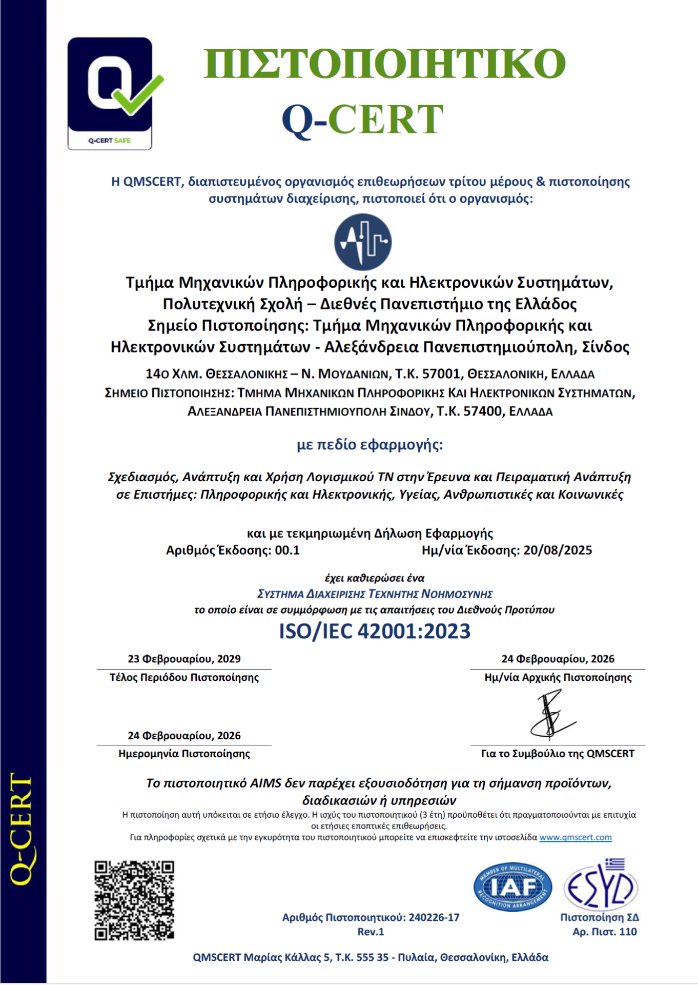 Το Τμήμα Μηχανικών Πληροφορικής και Ηλεκτρονικών Συστημάτων της Πολυτεχνικής Σχολής του Διεθνούς Πανεπιστημίου της Ελλάδος (ΔΙ.ΠΑ.Ε.) απέκτησε την πιστοποίηση ISO/IEC 42001:2023, το πρώτο διεθνές πρότυπο για Συστήματα Διαχείρισης Τεχνητής Νοημοσύνης (Artificial Intelligence Management Systems – AIMS).