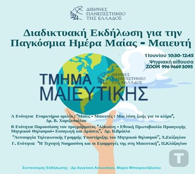 - Διαδικτυακή Επιστημονική Εκδήλωση του Τμήματος ΣΕΥ, ΔΙΠΑΕ για την Παγκόσμια ημέρα Μαίας – Μαιευτή, 1 Ιουνίου, ψηφιακή αίθουσα Τμήματος Μαιευτικής, Πρωτοβουλία και διοργάνωση της Προέδρου του Τμήματος Αναπλ. Καθηγήτριας Αγγελικής Αντωνάκου και της Λέκτορα Εφαρμογών, Μαρίας Μπουρουτζόγλου με συμμετοχή της Εθνικής Πρωτοβουλίας για την Προαγωγή του Μητρικού Θηλασμού «Αλκυόνη». Κεντρική ομιλήτρια ήταν η ακαδημαϊκή υπότροφος του Τμήματος Δρ. Βικεντία Χαριζοπούλου. Άξονας Επιστημονικές εκδηλώσεις Τμήματος.