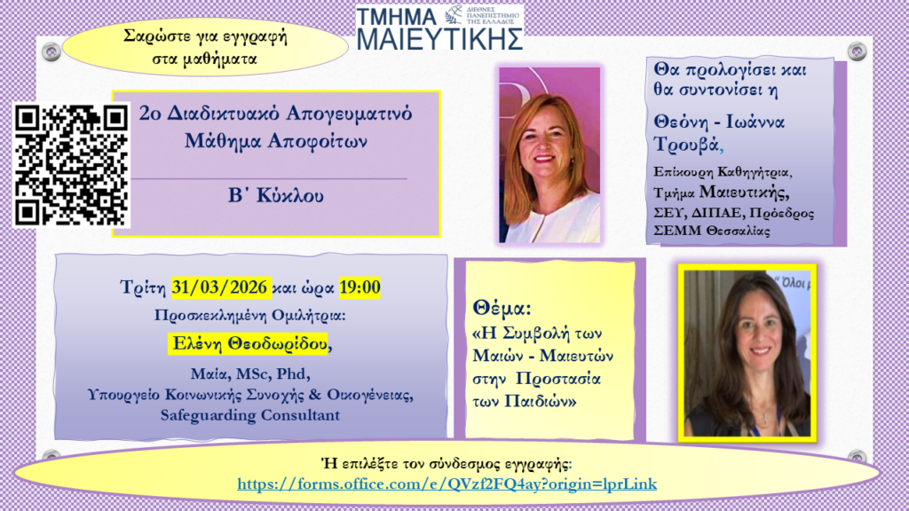 Το 2ο μάθημα στον Β’ κύκλο των μετεκπαιδευτικών μαθημάτων του Τμήματος Μαιευτικής, ΣΕΥ, ΔΙΠΑΕ, θα πραγματοποιηθεί την ερχόμενη Τρίτη 31/03/2026 και ώρα 19:00 μέσω zoom.