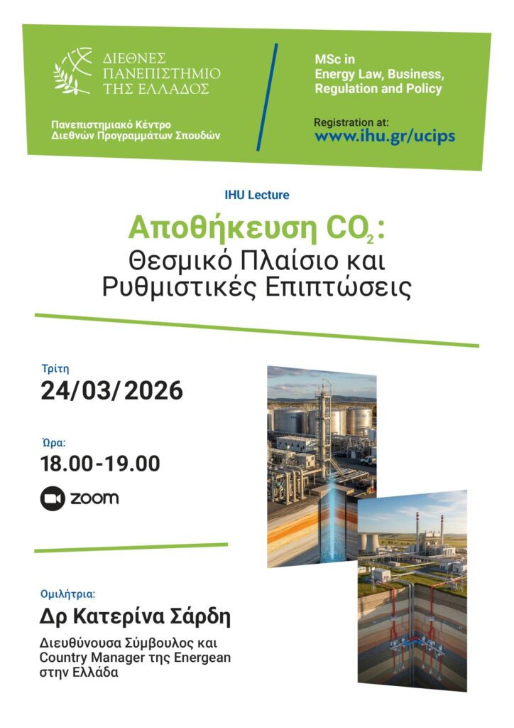 Σας προσκαλούμε στην εκδήλωση με θέμα “Αποθήκευση CO2: Θεσμικό Πλαίσιο και Ρυθμιστικές Επιπτώσεις” με Εισηγήτρια την Δρ Κατερίνα Σάρδη, Διευθύνουσα Σύμβουλος και Country Manager της Energean στην Ελλάδα, την οποία διοργανώνει το Διεθνές Πανεπιστήμιο της Ελλάδος, στo πλαίσιo του ΠΜΣ «Δίκαιο της Ενέργειας, Επιχειρήσεις, Ρυθμιστική και Ενεργειακή Πολιτική», την Τρίτη 24/03/2026, από 18:00 -19:00, διαδικτυακά.
