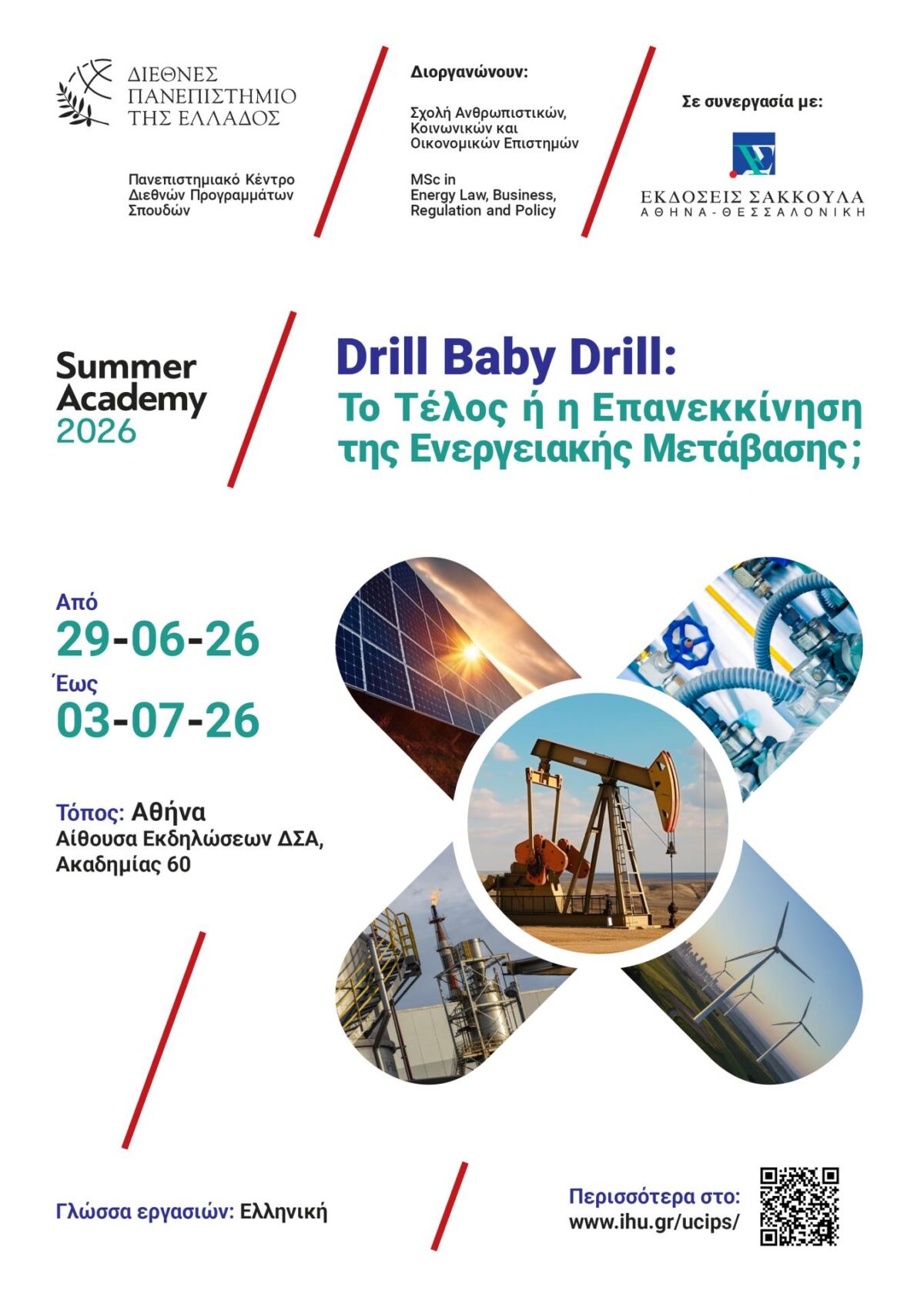 Μην χάσετε την ευκαιρία να συμμετάσχετε σε μια κορυφαία ακαδημαϊκή διοργάνωση που τοποθετείται στην αιχμή του διεθνούς ενεργειακού διαλόγου. Η Θερινή Ακαδημία 2026 υπό τη συνδιοργάνωση IHU – Εκδόσεις Σάκκουλα, αποτελεί μια μοναδική ευκαιρία εμβάθυνσης, δικτύωσης και ουσιαστικής συμμετοχής στη συζήτηση για το μέλλον της ενεργειακής μετάβασης.